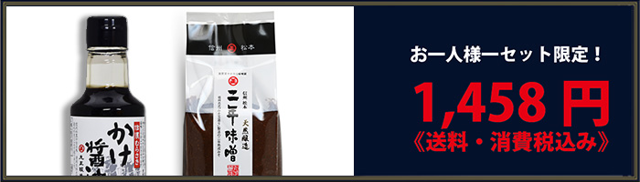 蔵元を代表する「二年味噌」と「かけ醤油」の2品を、はじめての方限定のお試し価格にてご提供。いつも使っている味噌、醤油との味の違いを、是非、ご体感ください。