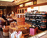 大きな味噌樽が目印の直営店舗。蔵元の商品全てが揃うのは全国でもここ直営店舗のみです。